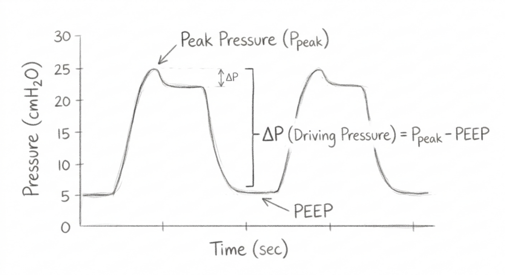 「プラトー圧30未満」「VT 6mL/kg」に続いて、最近よく人工呼吸器関連で出てくる言葉。 それが、**Driving Pressure(駆動圧:ΔP)**です。